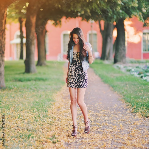 Stylish Long Hair Brunette Woman In A Leopard Animal Print Dress With Legs In Brown High Heel Shoes Denim Jacket Stock Photo Image Of Dress Girl 152826150